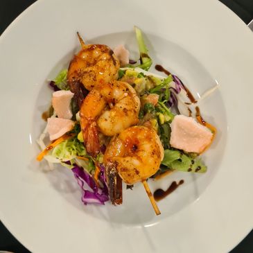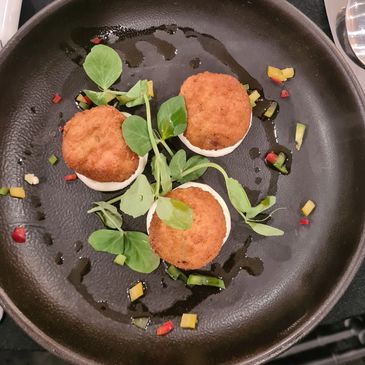 Served with Pea Mash and Pickled Salsa on Pearl Couscous Siracha Mayo
